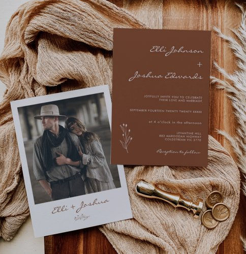 Minimalist Terracotta Bohemian Wedding Invitation ready to ship the fastest Minimalist Terracotta Bohemian Wedding Invitation quality productsMinimalist Terracotta Bohemian Wedding Invitation Simple modern and minimalist in style terracotta colored wedding invitation with removable drawn foliage motif. The back of the invitation features a photograph of the couple.