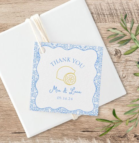 Thank You Lemon Blue Tiles Personalized Wedding Favor Tags products are in stock Thank You Lemon Blue Tiles Personalized Wedding Favor Tags order now with fast delivery service to your hand as soon as possibleExpress your gratitude with our customizable wedding thank you tags featuring a charming lemon design and soft blue accents. These elegant tags add a personal touch to your wedding favors or gifts making them perfect for showing appreciation to your guests. Personalized with your names and wedding date they’re ideal for any celebration from summer weddings to intimate gatherings. Add a unique and memorable detail to your special day with these beautiful thank you tags.