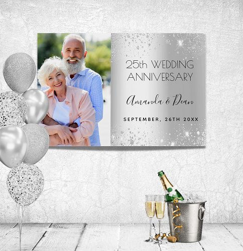 25th silver wedding anniversary photo glitter foam board products with good quality you can be confident 25th silver wedding anniversary photo glitter foam board order now with fast delivery service to your hand as soon as possibleA board for celebrating a 25th silver wedding anniversary. An elegant faux silver colored background decorated with faux glitter dust. Personalize and add your own photo of the happy couple. The text: The names is written with a black modern hand lettered style script. Tempates for names and a date. Can be used as a party welcome sign or as party wall decoration. Back: no design.