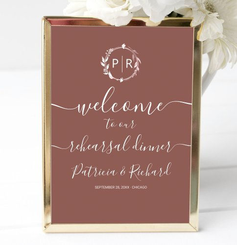 Wedding Rehearsal Dinner Welcome Sign Have a promotion during this period Wedding Rehearsal Dinner Welcome Sign quality products and have the highest number of reviews in the same categoryA simple chic foliage faux foil monogram terracotta rehearsal dinner welcome sign foam board. Easy to personalize with your details. Modern boho rehearsal dinner welcome sign foam board editable wreaths photo wedding invitation customizable calligraphy handwritten font simple elegant. CUSTOMIZATION: If you need design customization don't hesitate to get in touch with me through chat; if you need information about your order shipping options etc. please contact Zazzle support.