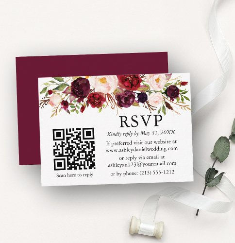 Watercolor Burgundy Floral QR Wedding RSVP Enclosure Card Have a promotion during this period Watercolor Burgundy Floral QR Wedding RSVP Enclosure Card order now with fast delivery service to your hand as soon as possibleModern Watercolor Burgundy Floral Wedding RSVP Card with your QR Code includes burgundy roses pink roses red roses and botanical greenery. Burgundy Back.