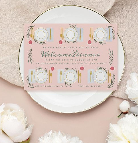 Illustrated Table Welcome Dinner Invitation ready to ship the fastest Illustrated Table Welcome Dinner Invitation order now with fast delivery service to your hand as soon as possibleOriginal illustration of table set for dinner; pink and green colors; editable title now available. Choose your own fonts