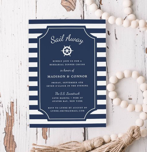 Popular Nautical Stripe Rehearsal Dinner Invitation if you are looking for it we recommend it Nautical Stripe Rehearsal Dinner Invitation You can read more about itSummery nautical themed rehearsal dinner invitations in classic navy blue and white feature a navy and white striped background with your event information in white on a navy blue center element accented by a ship's wheel illustration. Perfect for rehearsal dinners on yachts sailboats or dinner cruises at marina boat club or nautical theme venues. Invitations reverse to a pattern of tiny navy anchors.