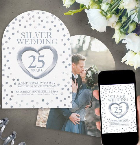 Popular 25th silver wedding anniversary heart invitation It’s a great choice 25th silver wedding anniversary heart invitation You can read more about itSilver colored confetti dots with silver heart effect 25 year wedding anniversary invitations. Simple modern heart and random silver look confetti dots 25th wedding anniversary design. Other matching silver wedding items are available or can be created by request. © Original graphics and design by Sarah Trett for www.mylittleedenweddings.com on zazzle.